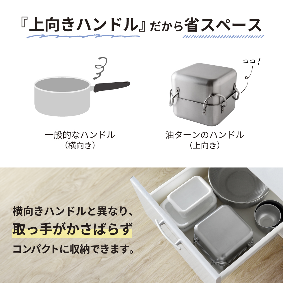 | 商品サイズ(約) | ●鍋(1個) ・内寸:幅16×奥行16深さ:7cm ・外寸:幅19×奥行19×高さ9.5cm、板厚:0.7mm ●網皿:径15×高さ1.5cm ●枠皿:幅17×奥行17×高さ1cm ◯収納時:幅19×奥行19×高さ14.5cm |