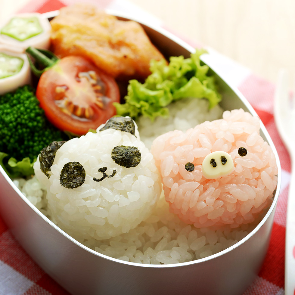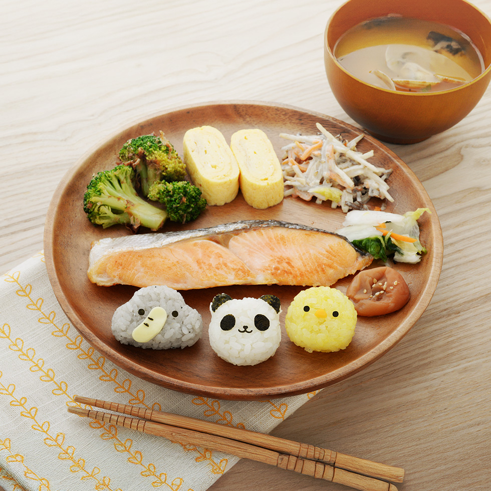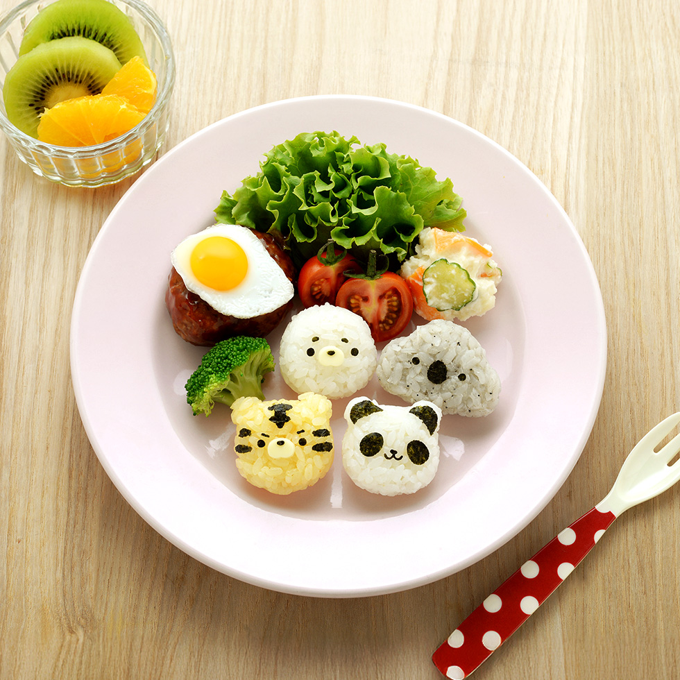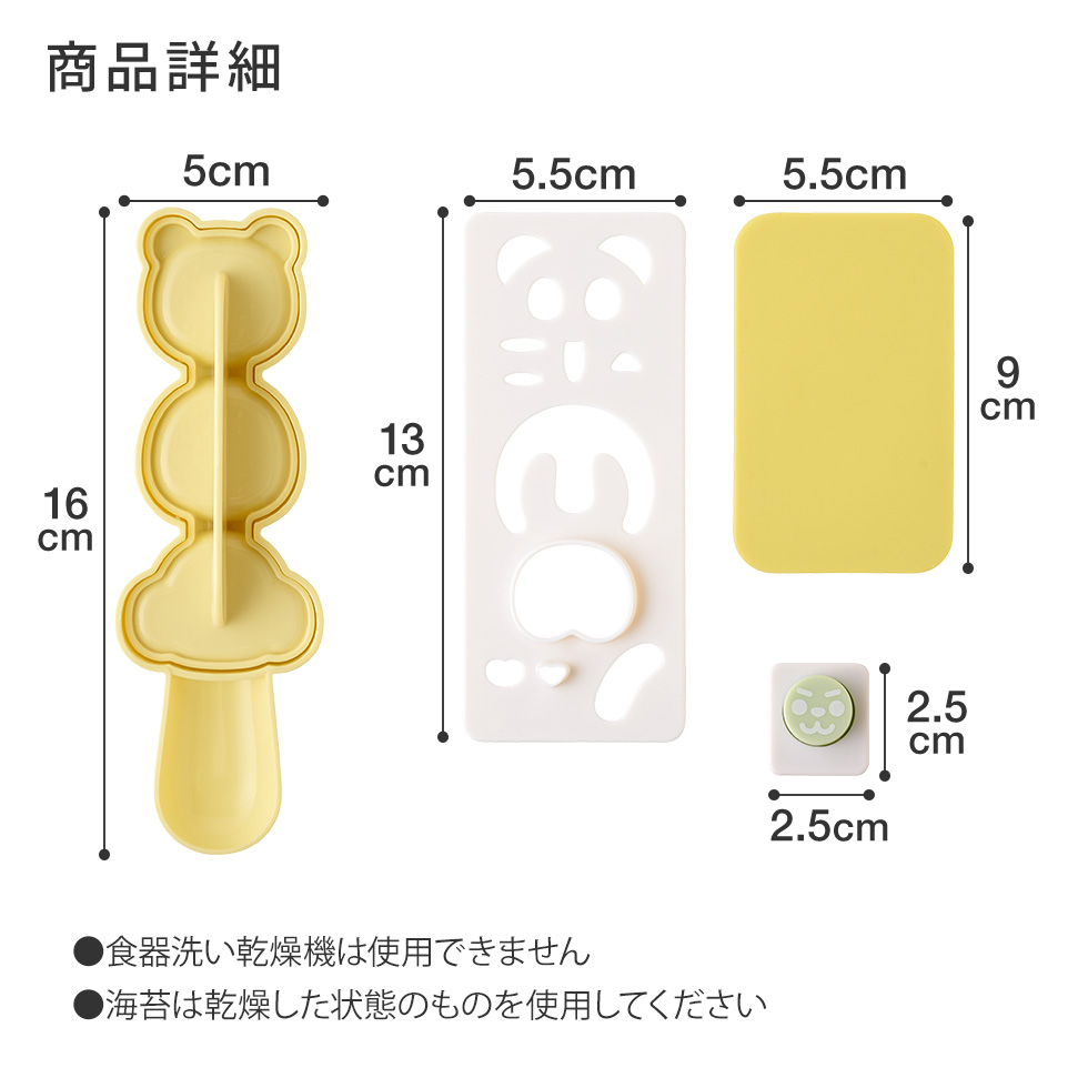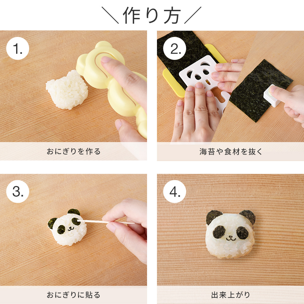3つのおにぎり型と海苔パンチ・カッターを組み合わせることで、パンダ・トラ・ブタ、ペンギン・ひよこ・あざらし・コアラ・ゾウ・サルを作ることができます。