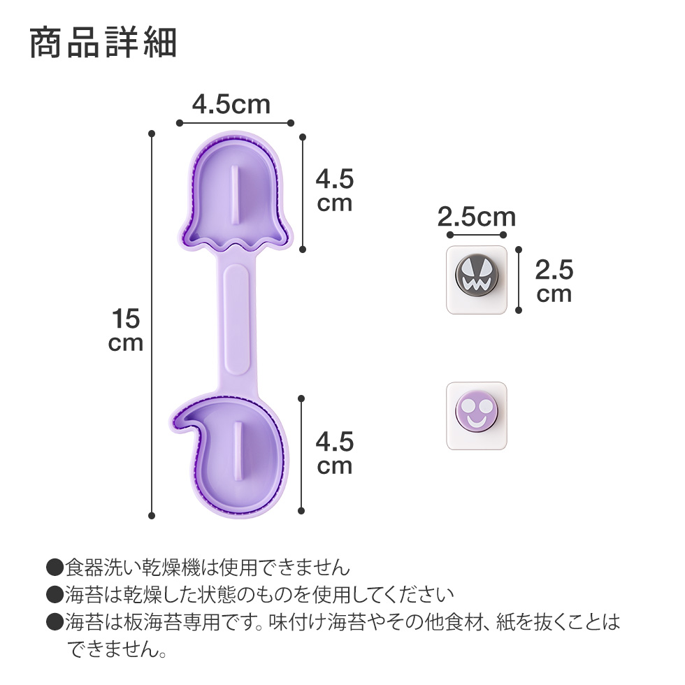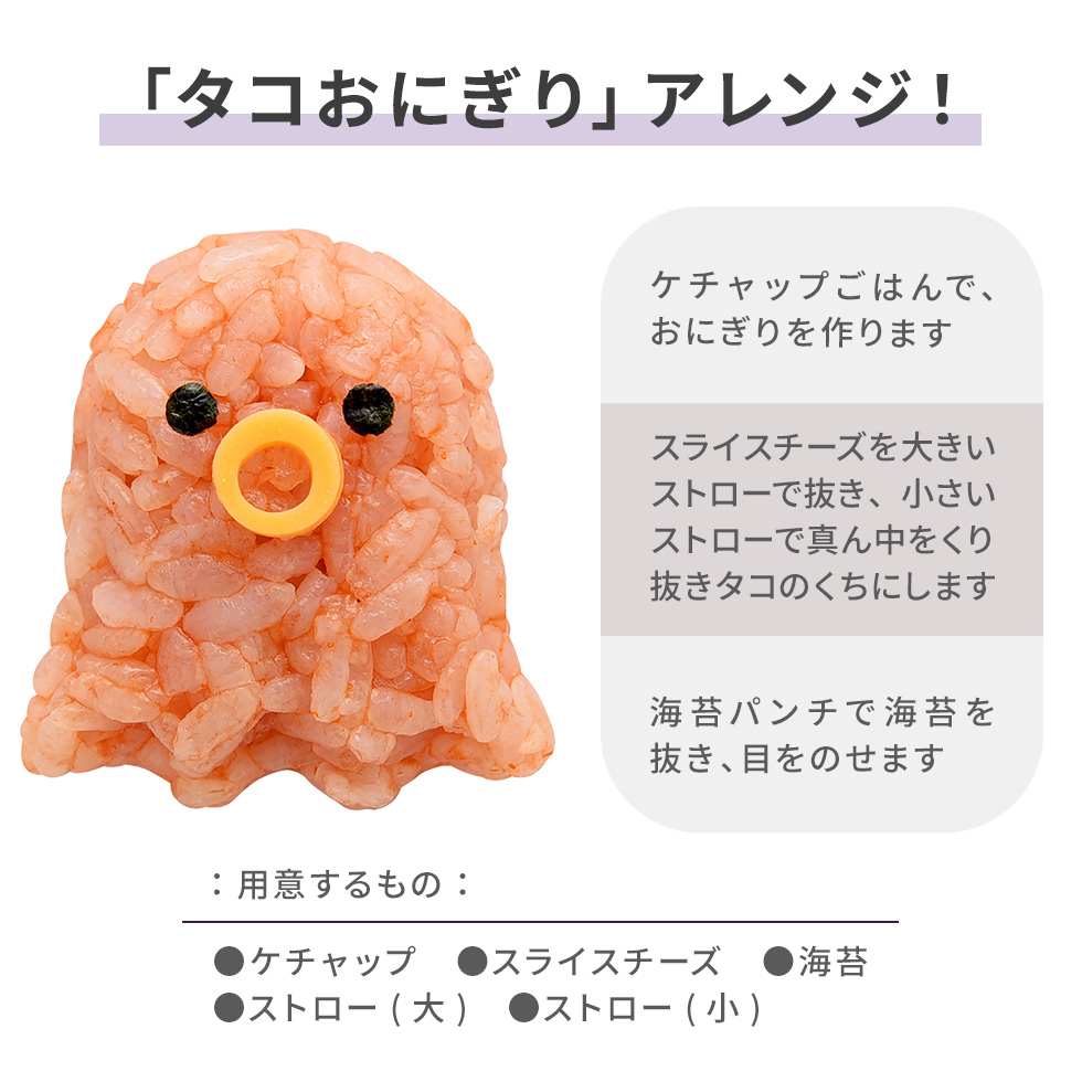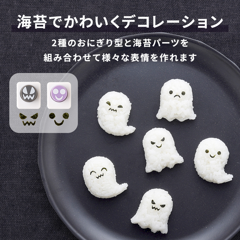 2種類のおばけ形おにぎりに海苔を飾ってかわいい顔を付けることができます。