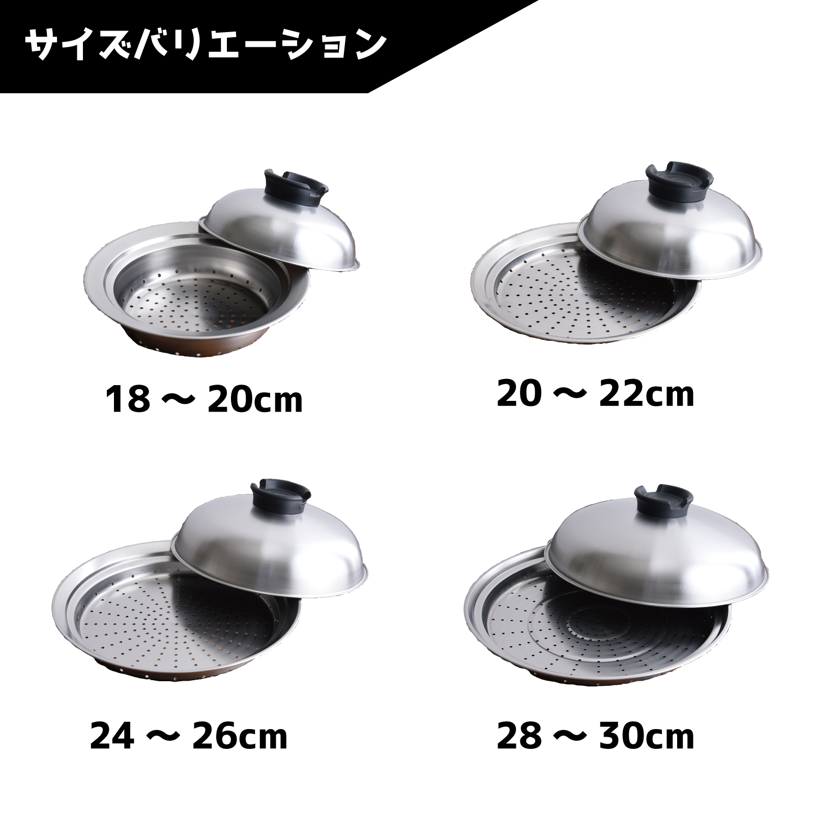 | 商品サイズ(約) | 適応サイズ:18~20cmのフライパンやお鍋に対応。 蒸しプレート:直径24×高さ5.5 cm 蓋:直径19.5×高さ8 cm |